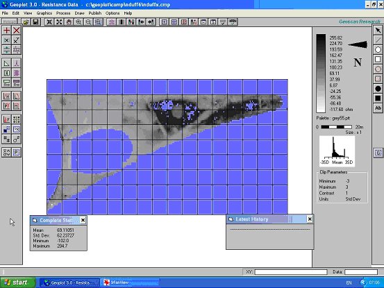 We also received training from Jon Kenny in resistivity surveying and conducted a survey of the village green to try to understand a steep lump of some ten feet across on the green in an essentially flat landscape. This resulted in some anomalies becoming apparent.