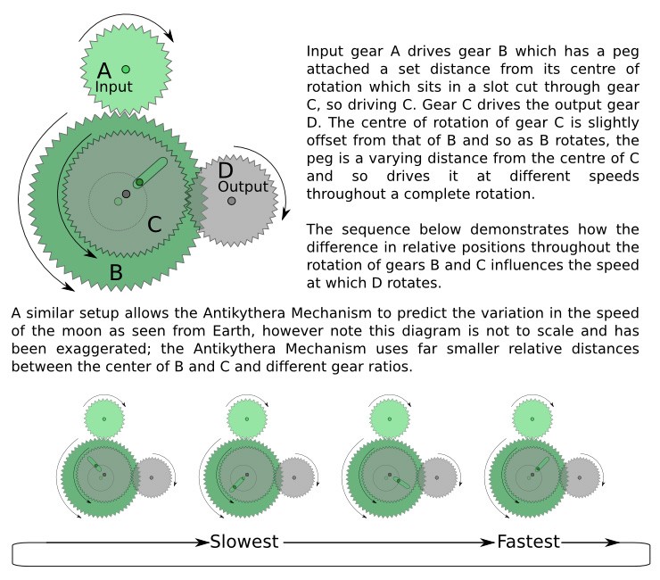 Whatever the original purpose of the Antikythera Mechanism it is abundantly clear that it represented the absolute state of the art in astronomy at the time; one particularly satisfying design within it takes into account the first lunar anomaly i.e. the fact that the speed the moon appears to move from earth is not constant. The diagram below explains how this works: