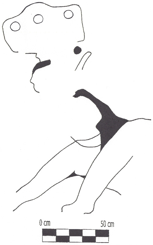 Figures C and D were originally found by Carlo Gay and his party in 1968 (Gay 1972, 48). Figure C consists of a highly eroded monochrome depiction of a human personage rendered in profile view and outlined with black pigment. The visible sections of the figure include sections of an elaborate headdress and a black cowl covering the back of the figure’s head, as well as the figure’s arms and upper torso. The figure’s lower torso and legs are missing (Figure 3).