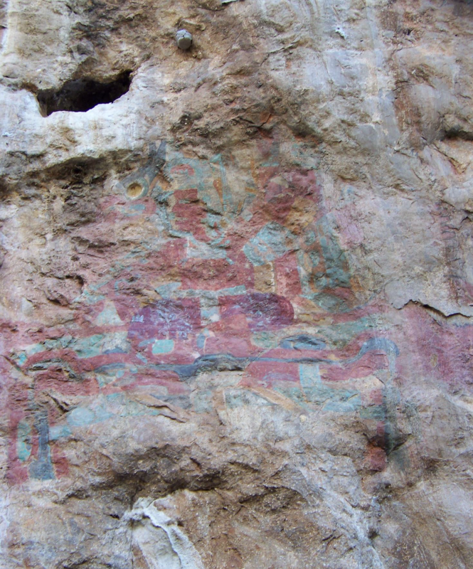 The two polychromatic murals situated on the cliff face between and above the grottoes are also depicted in the same style (Figure 3). Although some of the red paintings from the south grotto, such as Painting A-3, are reminiscent of Classic and Postclassic period depictions of rain gods (Grove 1970b, 26), the majority of the rock paintings in the south grotto form geometric designs and are more difficult to date. Only one of these red cave paintings, Painting A-1, appears to date to the Middle Formative period and may be a toponymic glyph (Lambert 2013).