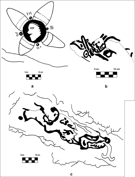 Painting 1-a (Figure 4a; Figure 7), for instance, consists of a circular area painted in black in the centre of which is silhouetted the profiled face of a human figure. Around this circular area, four ‘petals’ radiate outwards in a manner similar to the petaloid design on an Early Formative period sello from Tlatilco (Figure 2a in Kelley 1966, 745). As noted earlier, this cave painting is accompanied by four small punctate circles located between each of these petals.
