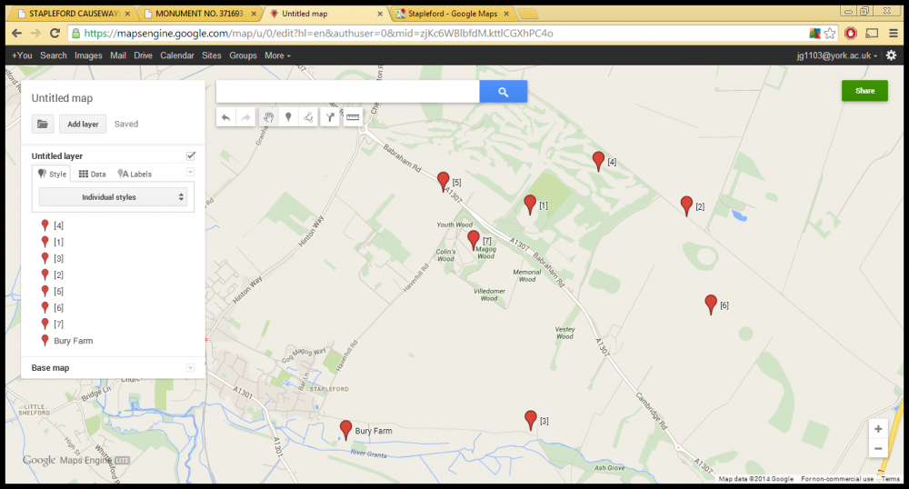 Bury Farm is located on land owned by Corpus Christi College and rented as a farm, covering the middle and lower river terraces of the Granta. It sits just outside the village of Stapleford and on the edge of the Gog Magog Downs. These low, gentle chalk hills contain a good deal of archaeological remains, particularly belonging to the Iron Age. The most significant feature is the Hill Fort on Wandlebury Hill ([1] on Map 1). This is described on the site’s English Heritage Pastscape record (2007) as a circular Iron Age fort made up of banks and ditches, which are still partly visible. Excavations in 1955 suggested that the original ditch and rampart was constructed in the 4th century BC, with refortification in the 1st century AD involving the construction of a second ditch and rampart within this.