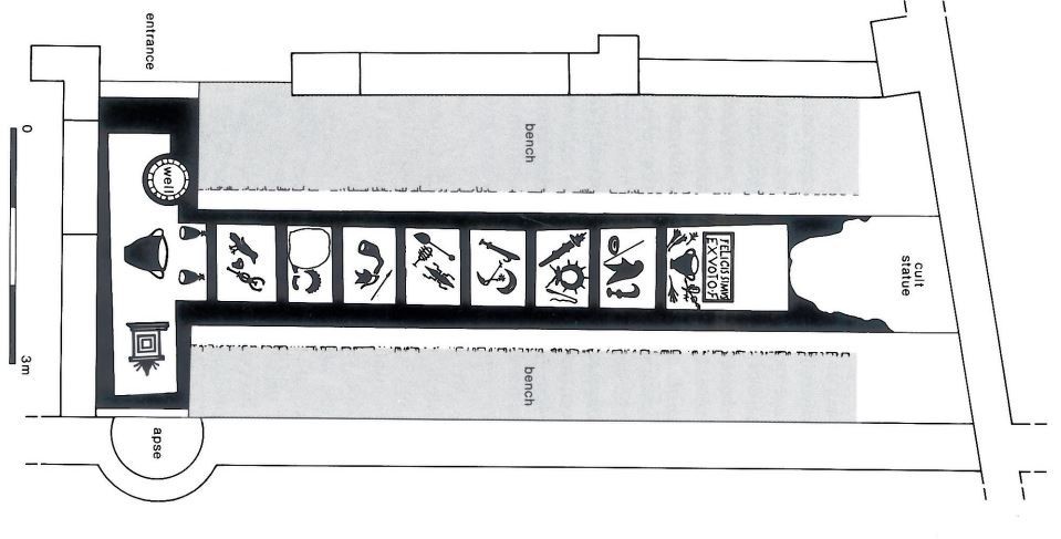 The architecture of Mithraea was intimately linked with the sacred narrative of Mithras. In the cave, Mithras killed the bull which was clearly connected with the arrival of life and light. Several inscriptions upon altars and votive offerings, such as an altar from Housesteads (Coulston and Phillips, 1988) and Whitley Castle, were dedicated to Sol Invictus, “Deo Invicto Mytrae” and Deo Soli Invicto (Wright 1943, 37). An inscription from Isca in Wales (CIMRM 809) was dedicated to Deo Invicto Mithrae from the II Augusta (Vermaseren 1956, 284). Therefore, the ability to control the amount of light that entered the temple was essential to Mithraism’s mythical story; the coming of life and light out of darkness was created by these conditions in their temples. One of the few ancient sources on Mithraism was from Porphyry. In his De Antro Nympharum 6, the Persian cult’s temple was described as a symbol of the cave where Mithras slayed the bull and as a model of the universe that he created.