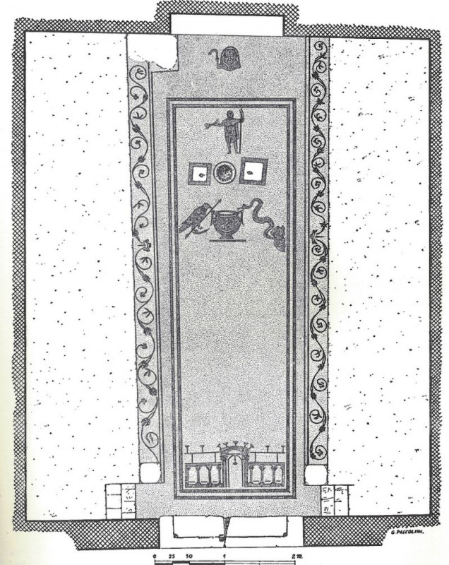 The temple did not have windows or they were very small and high up to reduce light (Shepherd 1998, 89). Rudchester, Carrawburgh and the London Mithraea were also dated to the third century, and reflect the general trend of Mithraea in the northwest provinces, where apses and rectangular niches were mainly found. Phases I and II of the Rudchester Mithraeum both include an apse with benches, and what appear to be sleeper walls. At Carrowburgh, the original temple was small and square, but later Phases, such as Phase IIa, have an elongated plan, a square niche, as well as benches. In Italy, the Mithraeum of Felicissimus, Ostia, does not have a projecting apsidal end but instead an apse right of the entrance (Figure 11) (Shepherd 1998, 226). Columns were most likely more for the superstructure’s stability, but they may have had a ritual use as well. The London Mithraeum has seven columns, which may represent the seven grades of the cult. In comparison, the Mithraeum at Ostia has eight panels of mosaic on the floor representing the seven grades with one dedicatory panel (Figure 11) (Shepherd 1998, 225). Another Mithraeum in Ostia, Sette Porte, has a mosaic on the floor of seven gates, which furthers the connection of the cult with the stars, planets and astronomy (Figure 12) (Vermaseren 1956, 138).