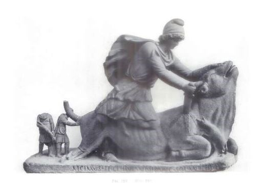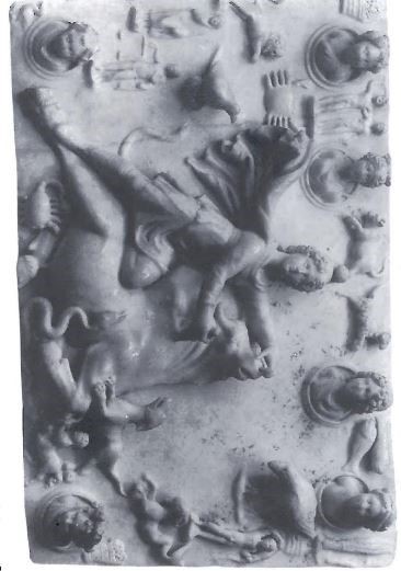 In London, the Mithras Tauroctonos with the zodiacal cycle was dedicated by Ulpius Silvanus of the II Augusta, apparently appointed at Orange (Figure 13 and 14) (Clauss 2000, 89). This scene was found at many Mithraea and it contains astronomical symbols, which were well attested at other sites. A relief found in Bologna (Figure 15) of unknown provenance contains the planets in the reverse order of the weekdays; other reliefs with astronomical symbols have been found in Sidon, Dura Europos, Brigetio (Szony, Hungary) and Rome (Figures 16, 17, and 18) (Clauss 2000, 87).