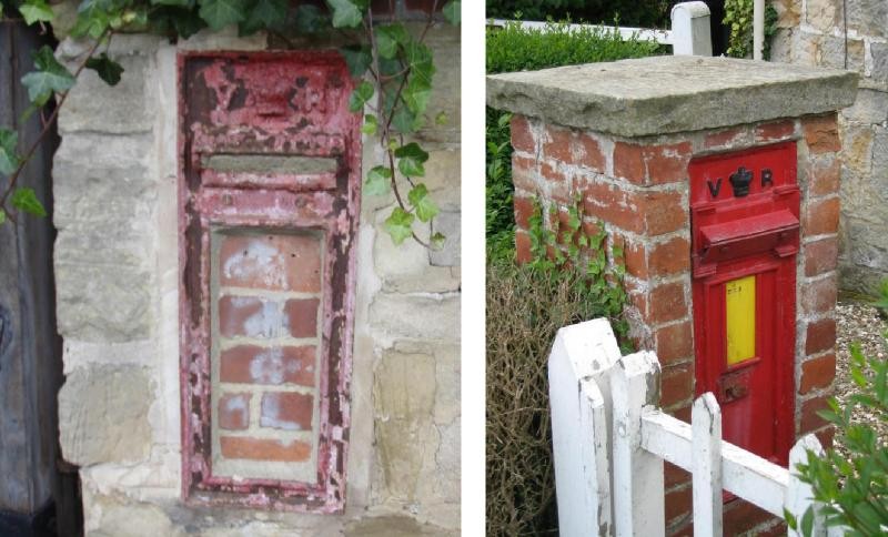 Tomorrow's postholes? Think of a tidy line of Victorian pillar boxes along a London thoroughfare; there are some in Kew and Richmond, all serving their various side-streets. The boxes actually go quite deep below the pavement. Now think of areas of cleared Victorian terraces in the East End. Maybe it's stretching the metaphor too far but perhaps future archaeologists will be able to trace what we have lost. Below are two boxes of similar vintage. On the left we have a decaying artefact, a bit like a pot sherd in a trench section. And on the right a nicely preserved piece of Victoriana hardly a dig away from Castle Howard.