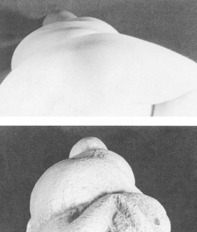 Prominent examples of non-functional artefacts in the Upper Palaeolithic are the anthropomorphic statuettes, or ‘Venus’ figurines. Historically, archaeologists have viewed these artefacts as sexual objects, created solely by males, as "clearly no other group would have had such an interest in the female form" (Collins and Onians 1978, 12-14). This is supported by Karel Absolon, who reviewed the figurines in his 1949 publication “The Diluvial Anthropomorphic Statuettes and Drawings, Especially the So-Called Venus Statuettes, Discovered in Moravia: A Comparative Study” (Absolon, 1949). When referring to Venus XIII, he believes that the “statuette shows us that the artist has neglected all that did not interest him, stressing his sexual libido only where the breasts are concerned” (Absolon 1949, 208). This interpretation stresses the figurines’ functionality as ‘prehistoric pornography’. However, some academics argue that this interpretation is sexist. Recent explanations, such as that of LeRoy McDermott, propose the figurines have an alternate symbolic value. To prove that the figurines are symbolic objects, McDermott (1996, 227) effectively uses “photographic simulations of what a modern female sees of herself”. The results demonstrate that the figurine’s shape was carved according to a woman’s “relationship to the eyes and the relative effects of foreshortening, distance, and occlusion” (McDermott 1996, 227). The link between modern women’s interpretations of the female form and the figurines, as shown in Figure 3, cannot be easily dismissed. From this perspective, the statuettes represent reference points for the women to symbolically connect with their bodies through visual art. Therefore, the increasing frequency of these figurines arguably represents complex symbolic and ideological ideas about self-expression. Generally, the non-functional artefacts and structures reviewed for the Upper Palaeolithic imply that symbolism and functionalism can occur in unison. Yet, some archaeologists, like Lewis-Williams, over-romanticize symbolic interpretations, which must be considered when exploring the meaning of non-functional material culture.