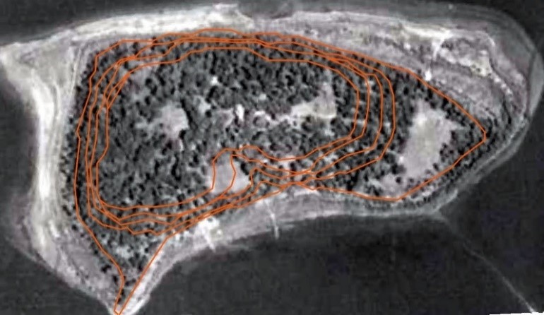 One of the most valuable mapping measures that helped give greater context to the faunal assemblage was investigating historic maps for the island to examine how its use has changed over time. Today, the entirety of the island is surrounded by a slim beachline, but 1940 aerial imagery located at the University of Minnesota John R. Borchert Map Library revealed that the beach once extended much further. Aerial imagery for successive years up until the modern day indicates that the water level has slowly risen since the mid-twentieth century, shrinking the usable portions of the island. The beach area available in the 1940s extends as much as approximately 25 meters out at the southwestern peak, and as much as 100 meters out on the north eastern edge (Figure 2).
