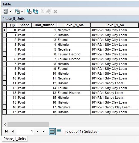 Due to the greater amount of spatial data recorded during test unit excavation in the second field season, the test unit attribute tables were more complex than the shovel test pits (Figure 5).