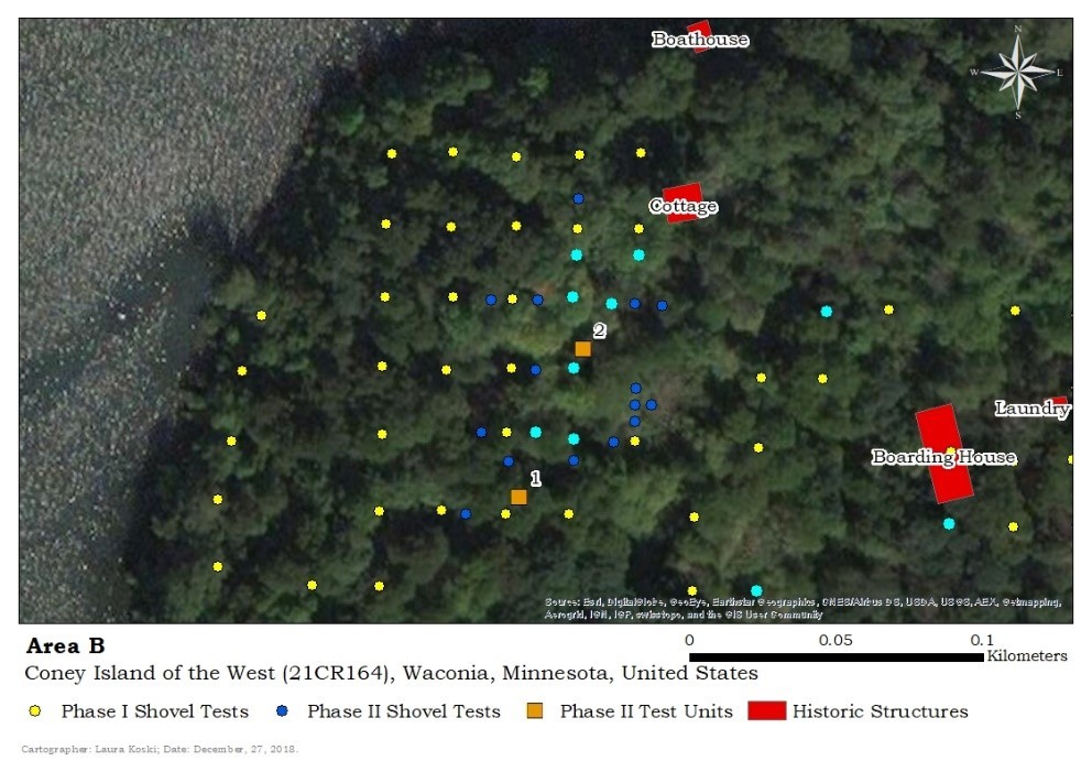 After both seasons of fieldwork were completed, all first season shovel test (n = 305), second season test unit (n = 18), and second season shovel test (n = 47) locations were drawn into ArcMap by the author utilizing a georeferenced hand-drawn field map created by Dr. Jeremy Nienow, one of the Principal Investigators for the project (Figure 3).
