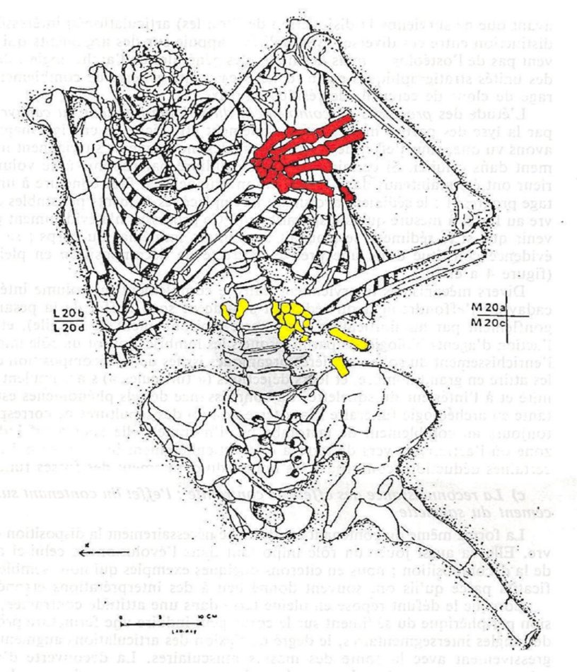 Figure 1 demonstrates the effects of decomposition in a filled space on the labile articulations. The phalanges, metacarpals and carpals (coloured red) of the right hand are still (mainly) in articulation. Duday explains the maintenance of articulation as the effect of "progressive clogging" (colmatage progressif) (Duday et al 1990:40) as the body slowly decayed the sediment filled in the empty volumes left by the absent soft tissue. In a filled space, decomposition creates empty spaces within the volume of the body that bones can move into. This can be seen in Figure 1 — the bones of the left hand (coloured yellow) have fallen into the empty space created by the decay of the soft tissues in the abdominal cavity.