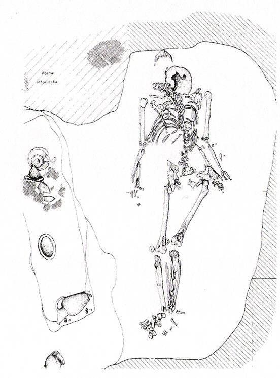 Primary inhumation in a filled space, such as a coffin or shroud, can have a peculiar effect on the appearance of the skeleton. The presence of a container or wrappings around the body can affect how the bones appear in the grave. Figure 2 illustrates what is known as "effet de parois", or a "wall effect" on the bones, where something has provided a support for the bones as the body decayed, resulting in skeletal elements that appear to be precariously balanced. This can be seen more prominently in Figure 3, Grave 22 at Vedbæk Bøgebakken where the cadaver appears to have been wrapped in organic material prior to deposition, which results in skeletal remains that appear unnaturally arranged in the grave.