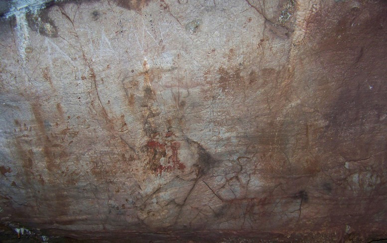 Although also highly eroded, Figure D is a polychrome rock painting (Figure 5). Gay’s original rendition and description of this painting suggested that it consisted of a human figure decorated with an orange-red pigment and clothing outlined in black paint (Gay 1972, 51, Figure 21a). A re-examination of Figure D suggests a different interpretation of the subject matter.