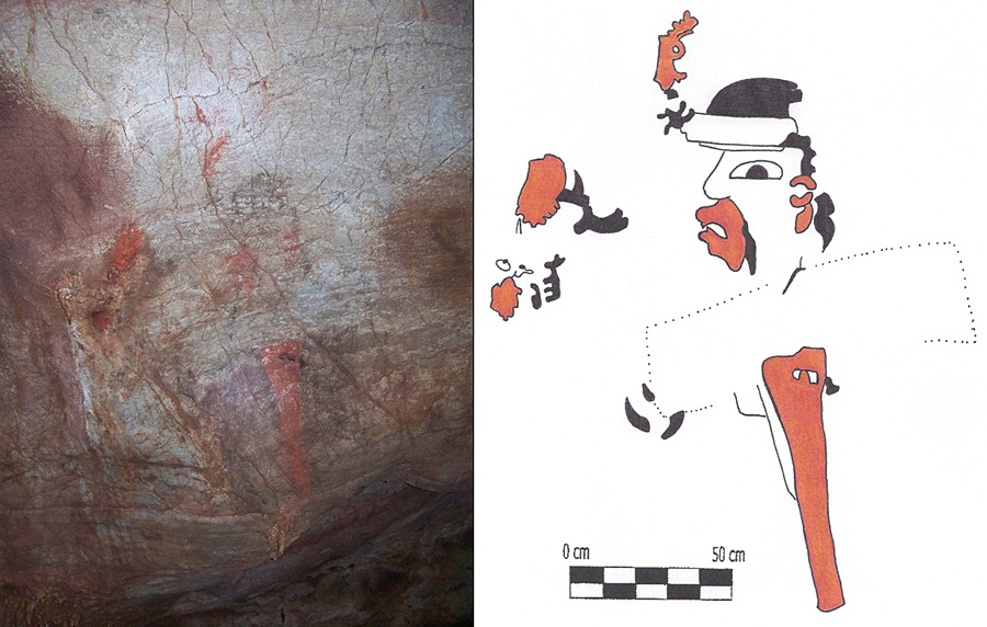 Located on the right wall as you enter the so-called ‘Gallery of Drawings’, Painting 1 consists of a mural containing four distinct anthropomorphic figures (hereafter designated as Figures A, B, C, and D in order from east to west). Figures A and B are the most well-known and were first reported by Carlo Gay and Frances Pratt in 1967 (Figure 2).