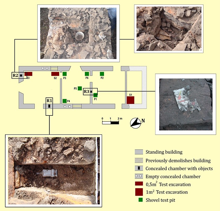 Among these findings, there were some odd ones: a glass bottle, a playing card, an animal bone and a pot (Figure 3). What was odd about them? They were found inside voids or “chambers” within the walls. These were not just voids between bricks, but structured and sealed chambers within the structure of the wall: their existence was intended. Three of these chambers, located in three different walls, contained the mentioned objects, while other chambers were empty. They could not be seen nor accessed from outside or inside the house, since the walls concealing the chambers had no marks or signals and the plastering had no cracks. Thus, we considered these objects were not accidentally there, like trapped coins between the cracks of the floorboards; the chambers and their content had more likely been deliberately concealed (Mackay 1991). Figure 4 shows the location of the chambers with concealed objects.