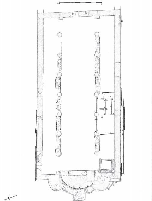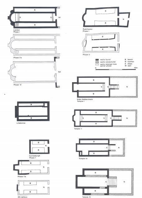 The layout of the temple needed to account for the unstable ground during construction and also in the late third century, when the building suffered a collapse of the south western ceiling. Instability was caused by ground water and subsidence due to the temple’s proximity to the stream. The construction of the temple was fairly standard in that the foundations, walls, buttresses, apse and sleeper walls were constructed with mortar, ragstone and tile. Mortar was placed first with ragstone above, then ragstone and tile courses (Figure 8) (Shepherd 1998, 58-59). The effects of the ground’s instability were signalled by the sleeper walls and apse constructed with three buttresses (Shepherd 1998, 58). The building was 58.5 feet long by 26 feet wide. Like many Mithraea, the temple was orientated east to west. There was also evidence of wooden planks in the north and south aisles which could have been benches (Grimes cited Shepherd 1998, 63). Many other Mithraea have benches as well; Carrawburgh, Rudchester, and on the mainland, Nida (Heddernheim) are some examples (Figure 9). Significant changes occur in Phase III (late 3rd century CE), the collapse, the columns were removed, the cult icons were buried in Floor 5 (Figure 6), and the west end was rearranged (Figure 6) (Shepherd 1998, 227). In the early fourth century the layout became more open; evidenced in Floor 6a by a slab with INVICTO inscribed on it, dating 307-308 CE (Figure 10). Floor 3 raised the level to the top of the steps to the nave signalling the end of the sunken nature and by Floor 5 the well was covered (Shepherd 1998, 72, 225). Whether this signalled the end of the temple functioning as a Mithraeum is debatable. The Bacchic sculptures and votive offerings suggest that it was no longer a Mithraeum as argued by Henig (1998, 230).