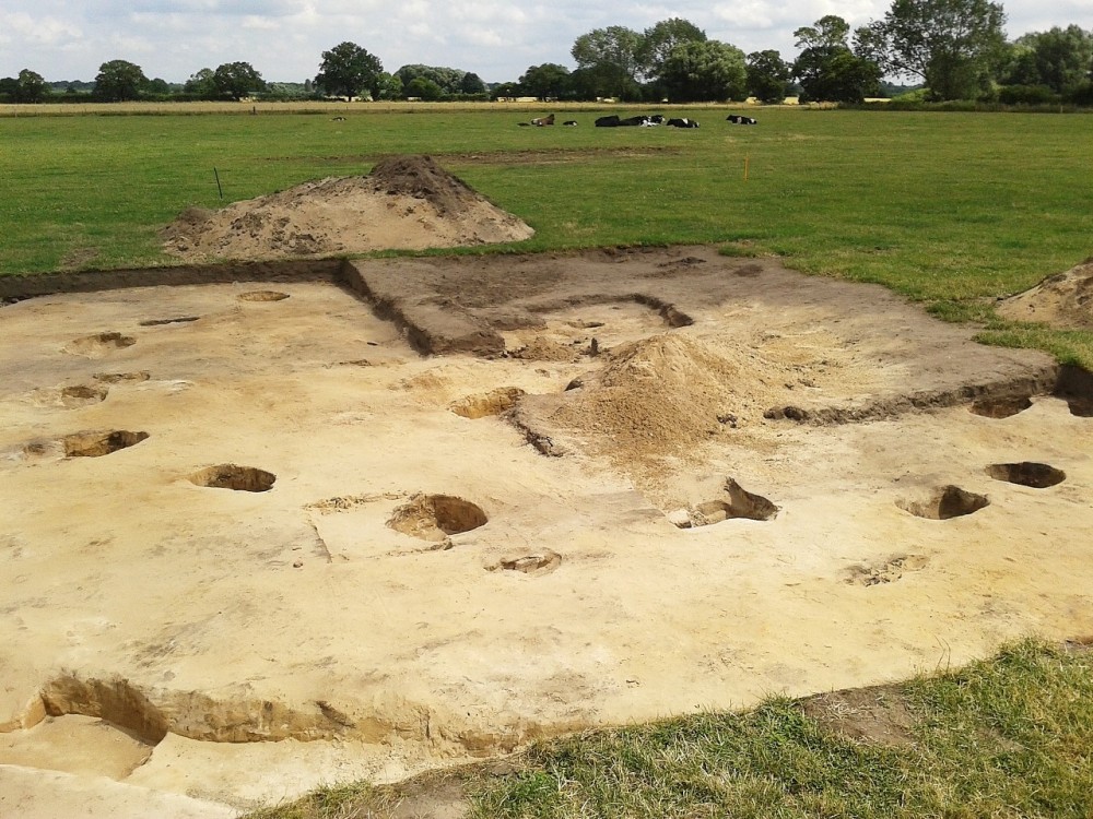 In July 2013 and over June-July 2014 the site was revisited by the community team, hoping to reveal more of the circular feature that had been partially uncovered in the previous dig. In the first year of the project, the feature was thought to be a ring-ditch enclosure due to the lack of evidence for post holes. The more recent excavations together uncovered a complete ring ditch with an outer diameter of 20 metres, along with a series of pits approximately one third of the way towards the centre of the circle, clearly suggestive of post settings (see Figure 1). Unfortunately the entire site has been truncated by medieval and modern ploughing and no trace of floors or ancient ground surfaces remains.
