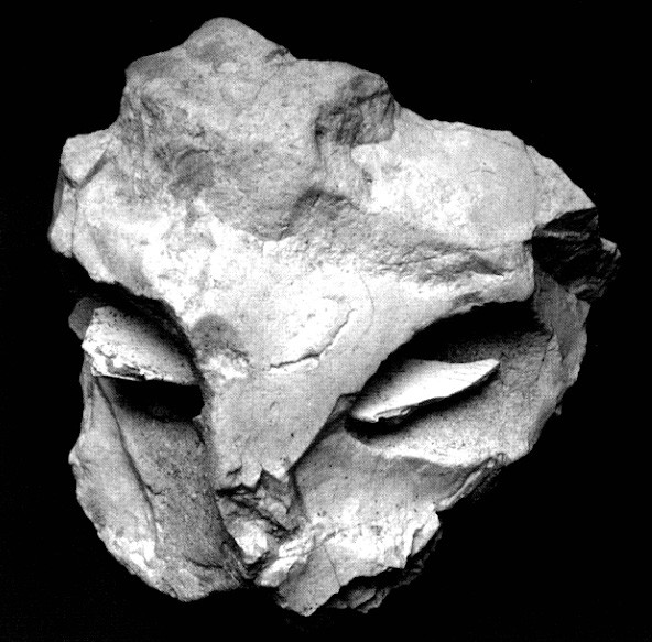 Similarly, the discovery of a proto-figurine ‘mask’ from the Mousterian period at La Roche-Cotard in France, reinforces this idea that Neanderthals produced symbolic, non-functional artefacts. The sculpture consists mainly of a large flint stone featuring a "natural tubular perforation" (Marquet and Lorblanchet 2003, 663), in which bone was purposely wedged to create the appearance of a human face (Figure 2). Careful examination demonstrates that “the object has been worked to give it a more regular shape” (Marquet and Lorblanchet 2003, 664), suggesting the individual[s] who created the mask laboured to produce an intentional image. Furthermore, it is significant that the mask was “not only picked up and brought into the habitation, but was also modified … to perfect its resemblance to a face” (Marquet and Lorblanchet 2003, 667). This, coupled with the time it took to manufacture, indicates the value of the artefact to the creator[s]. In addition, at the time of its production (approximately 32,100 kya), the “existence of beliefs and symbolic behaviour is already firmly attested; people were burying their dead, sometimes with offerings and deposits or spreads of red ochre” (Marquet and Lorblanchet 2003, 669). The mask could thus be viewed as a symbolic “ornament” (Marquet and Lorblanchet 2003, 669), perhaps to embody a deceased individual or idol. Archaeologists may therefore interpret the ‘mask’ as representing complex symbolic ideas which centre on the notion of death. However, it is possible, through active representation of an individual, that the figurine acted as a functional artefact. The value of the item, combined with inferred links to burial practices, suggest that the artefact may have been used in ritualistic performance associated with mortuary rites; it may be argued that this represents a reliance on material culture in ritual practice, although this cannot be corroborated.