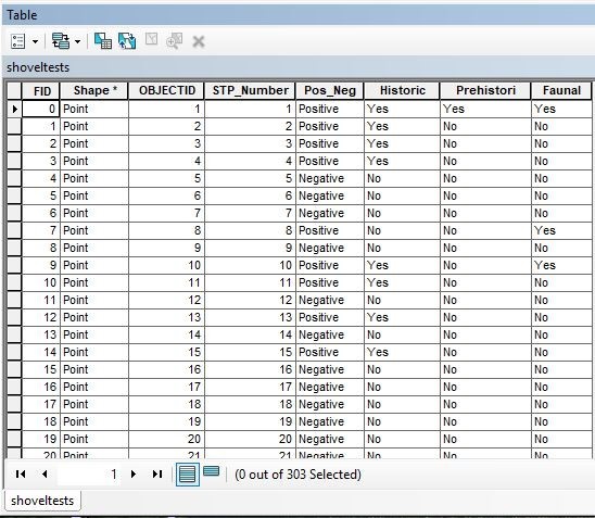 Test units were one meter by one meter and were excavated twenty centimetres past culturally sterile soils. Attribute tables were created for the shovel test and test unit shapefiles. Since depths were not consistently recorded for artefacts recovered from shovel tests, the shovel test attribute table consisted of only five entered data columns: shovel test number, a positive/negative column, and columns named ‘historic’, ‘prehistoric’, and ‘faunal’ (Figure 4).