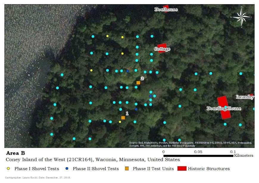 After both seasons of fieldwork were completed, all first season shovel test (n = 305), second season test unit (n = 18), and second season shovel test (n = 47) locations were drawn into ArcMap by the author utilizing a georeferenced hand-drawn field map created by Dr. Jeremy Nienow, one of the Principal Investigators for the project (Figure 3).