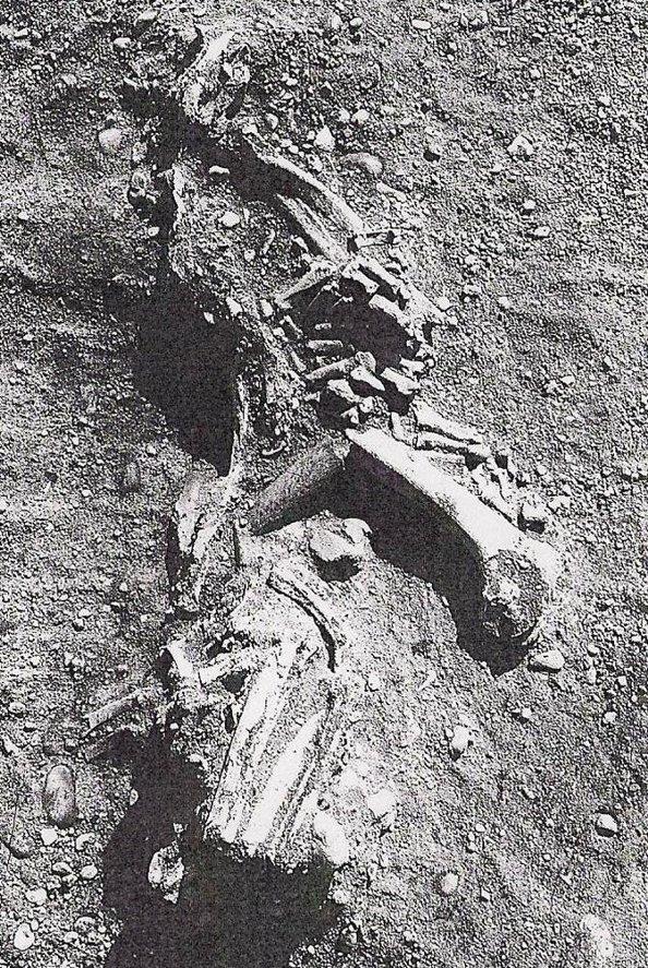 Primary deposits that have been allowed to decompose in an empty space will appear differently to the excavator. As the body decays, the lack of pressure from surrounding sediment allows the bones to move outside the initial volume of the cadaver. As the connective tissues decay, the bones will rotate outwards, giving the impression of more dispersed skeletal elements. Figure 4 demonstrates the scattered appearance of a skeleton that occurs when the body has decomposed in an empty space. The os coxae (ilium, ischium and pubis) are completely fragmented and illustrate the degree of displacement that can occur during decomposition.