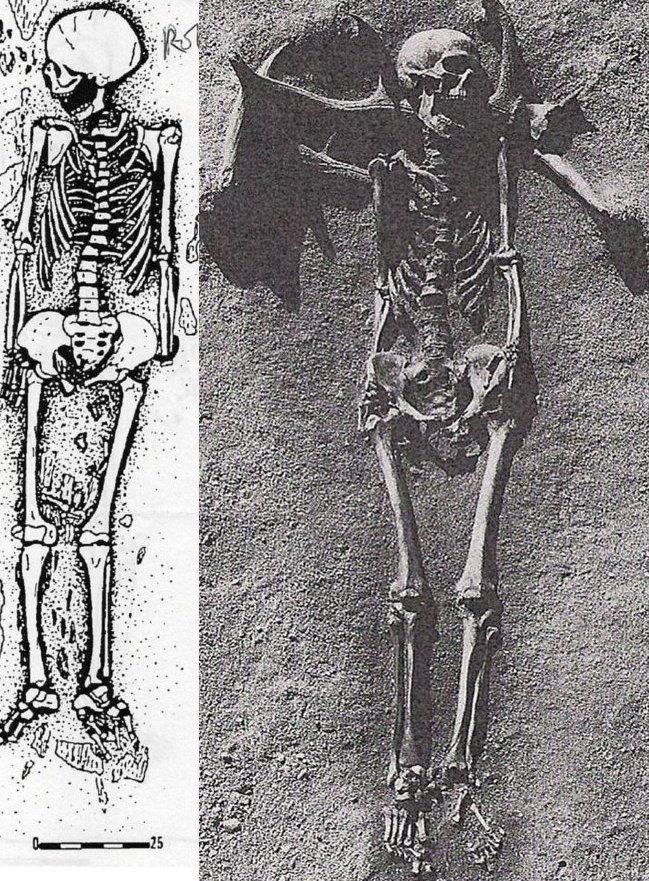 Primary inhumation in a filled space, such as a coffin or shroud, can have a peculiar effect on the appearance of the skeleton. The presence of a container or wrappings around the body can affect how the bones appear in the grave. Figure 2 illustrates what is known as "effet de parois", or a "wall effect" on the bones, where something has provided a support for the bones as the body decayed, resulting in skeletal elements that appear to be precariously balanced. This can be seen more prominently in Figure 3, Grave 22 at Vedbæk Bøgebakken where the cadaver appears to have been wrapped in organic material prior to deposition, which results in skeletal remains that appear unnaturally arranged in the grave.